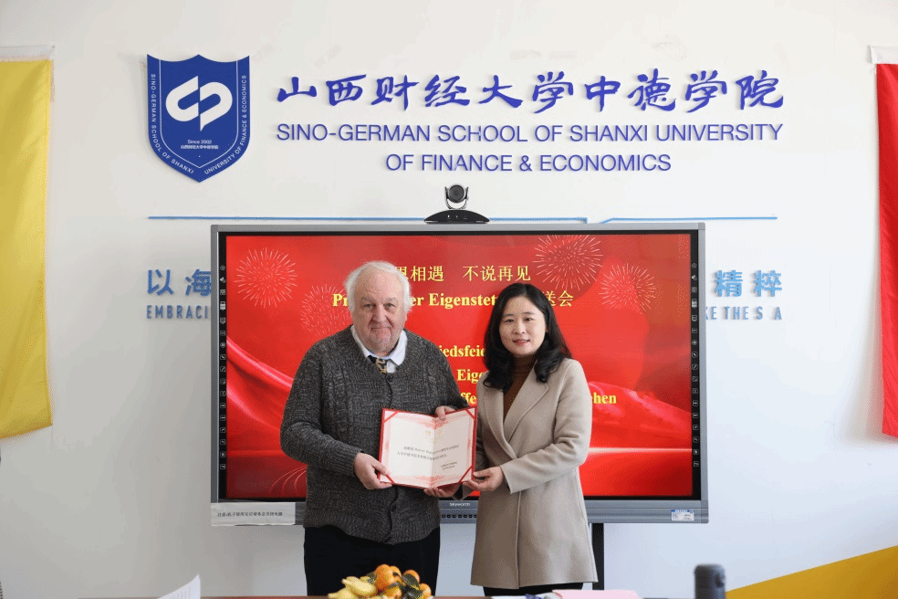 会议开始,史贞院长代表学院向躬耕中德教育15年的Eigenstetter教授致辞,向Eigenstetter教授为永利集团304am登录的发展所作出的贡献表示衷心的感谢。希望Eigenstetter教授一如既往继续关心和支持永利集团304am登录发展,为学院学科建设、德语及专业课发展出谋划策,作出贡献。同时也真诚欢迎Eigenstetter教授常来中国看望老朋友,共叙友谊情。史院长代表学院向Eigenstetter教授颁发证书,献花,并送上题有 “十五年致力中德教育务实求真,四十载躬行学识润道”的书法作品。