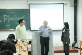 Eigenstetter教授还展示了在德国咖啡馆点餐与结算的短视频。这是大一同学们正在学习的一项交际知识,通过这个简短的视频,增加了同学们的知识储备。视频结束后,教授与两名同学一起模拟了一个简单的点餐交流对话场景,丰富多彩的对话使观众的欢笑不止。