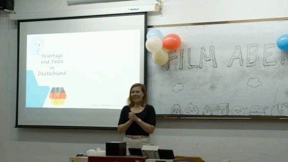 活动第一阶段由4组同学分别用德语介绍了中国的传统节日——春节、清明、端午和中秋。他们不仅详细介绍了每个节日的历史背景和文化内涵,还通过短片展示了节日的庆祝方式和独特习俗。随后,助教Schubert介绍了德国的狂欢节、复活节和啤酒节。通过PPT和视频,同学们感受到了德国狂欢节的五彩斑斓、复活节的彩蛋寻宝、啤酒节的畅饮欢歌。浓郁的德语学习氛围和中德节日氛围洋溢在整个教室中。