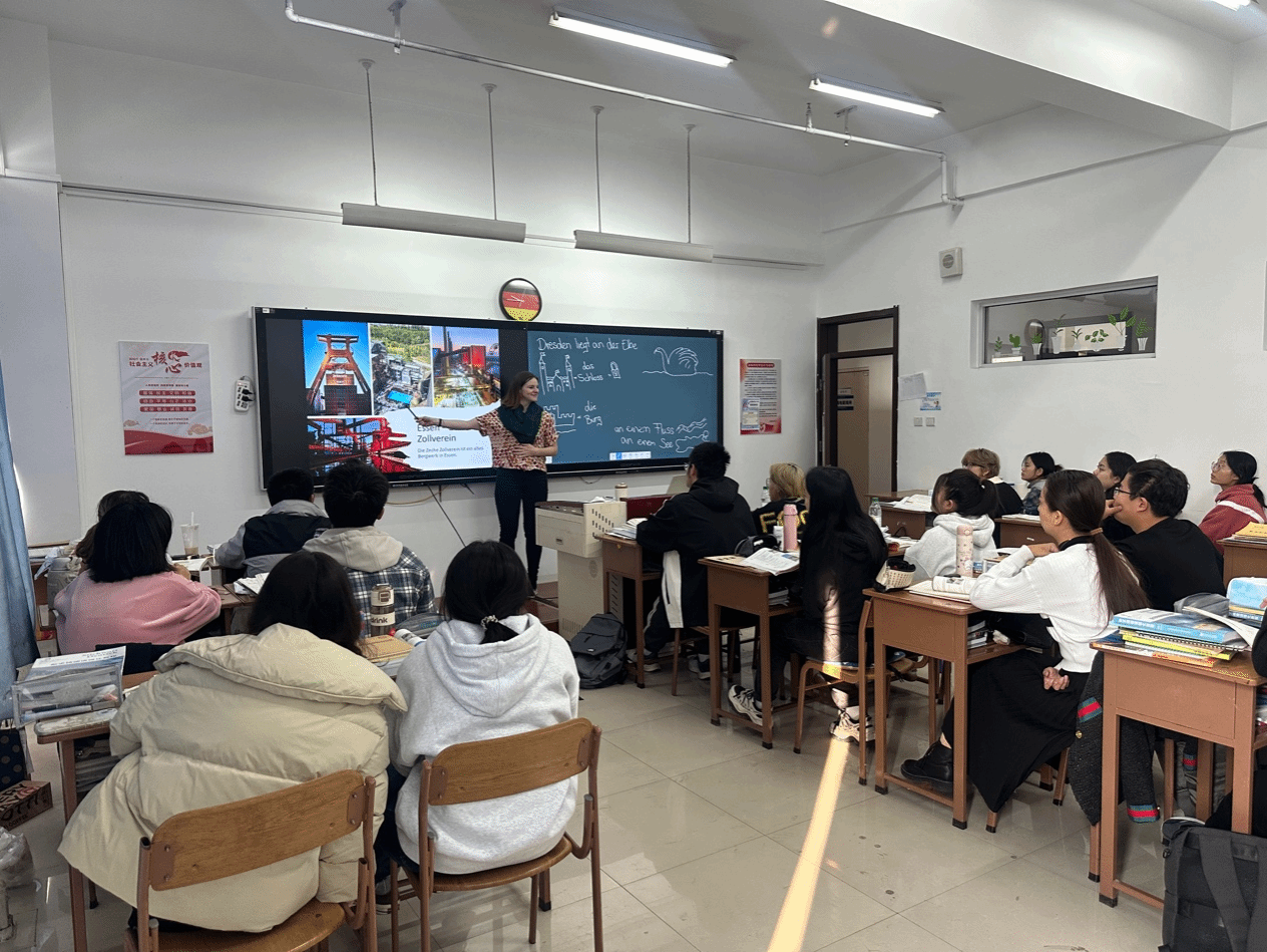 Steiner老师是一位有着丰富教学经验的德语老师,拥有歌德学院学习背景,其教学风格轻松、幽默。她极其重视课前准备,在11月5日与中方德语教师沟通课程进度及内容之后,精心研读教材,结合学情确定教学内容,融入丰富资源,以提升课堂的趣味性与互动性。