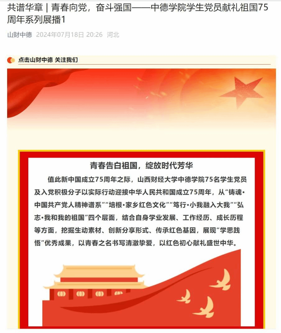 为深入学习党的二十届三中全会精神,全面贯彻落实党的教育方针,推动党史学习教育常态化长效化,引导青年学生传承红色基因、凝聚精神力量,教育中德学子讲好红色故事、传播中国声音,2024年暑期,永利集团304am登录学生党员聚焦“传承红色基因,学思践悟中国共产党人精神谱系”这一主题,结合学习和工作实际,深刻感悟伟大精神,开展专题系列推送,以实际行动庆祝新中国成立75周年。